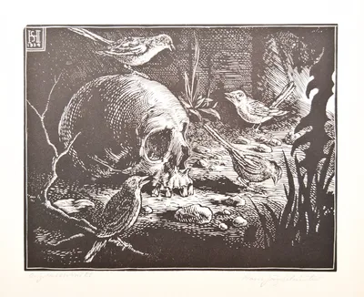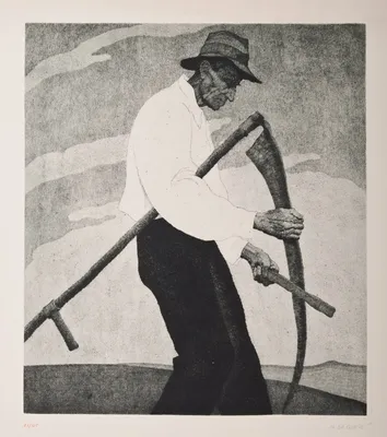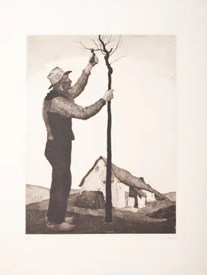 Boer knipt twijg. Litho, ca. 1948. Numbered 30/100 45 x 35 cm.