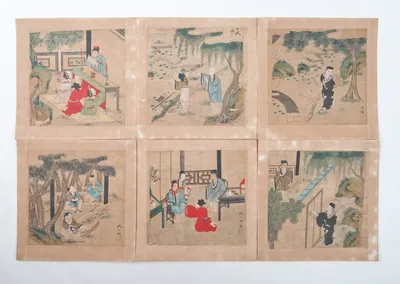 watercolour on silk, each ca. 24x21 cm., attached on thin paper in corners, bound with ribbons, ca. 1900.