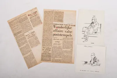 Original drawings in Indian ink. 1. Raoul Eduard Philippe M. composition drawings for publication in het Parool in 1963. The trial was about the accusation against Mr. M. who forged...