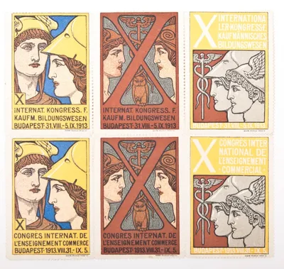 Budapest 1913 Internat. Kongress f. Kaufm. Bildungswesen. Magyar Pöldrajzi intezet M.T. Two complete sets of 3 picture-stamps.
