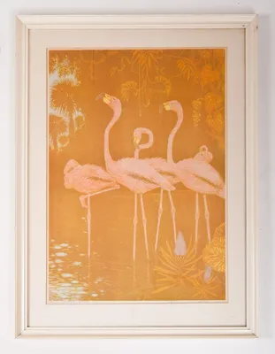 Flamingos. Woodcut in 4 colour print. Ca. 1930. 50 x 36 cm. In frame behind glass.