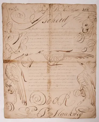Set of 15 sheets of paper, 18th-century. e.g. "Afscheid". By P.S. Haakweg. Poem with calligraphy and drawn birds. All sizes 41 x 34 cm