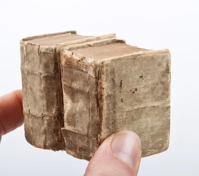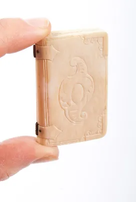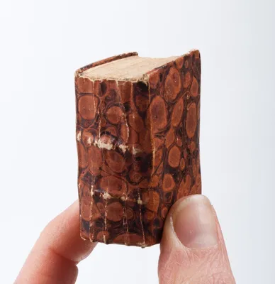 19th-century miniature (51 x 32 mm) book simulant with religious illustrations.