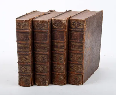 par le reverend pere Dom Augustin Calmet, seconde edition. Geneve, Marc-Michel Bousquet, 1730. 4 parts. Bound in brown leather bindings with ribbed spines. With frontispiece of...