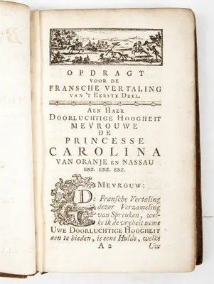 Amsterdam, T. Crajenschot, 1753. (16), 266, (6=inh.)pp. With 23 copperengravings, e.g. two folding: "Vorstelijke praalbed op 't Hof in 's Hage 25 November 1751" and "Lijkstatie...