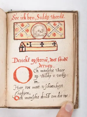 Almanack (duerende tot inder ewicheit) en gebedenboekje. Manuscript, ca. 1545; (60 + 2 blank) vellum leaves written in one hand on both sides, in brown, red, and blue; decorated;...