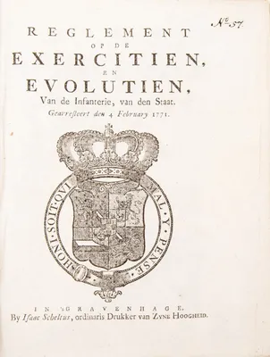 gearresteert den 4 February 1771. 's gravenhage, Isaac Scheltus. 564 pp. 4to, in modern half-cloth binding. Consists of 5 parts; 1. Het exerceeren in het generaal. 2. Het marcheeren,...