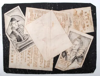 Netherlands, ca. 1780. With 3 documents, two portraits and an empty leaf with study for a portrait. "Bedrieglijk" = trompe l'oeil, drawn as if documents are arranged on top of...