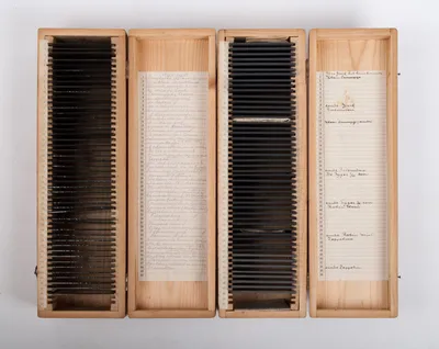 Two wooden boxes, each containing 48 glass plates, ca. 1920.