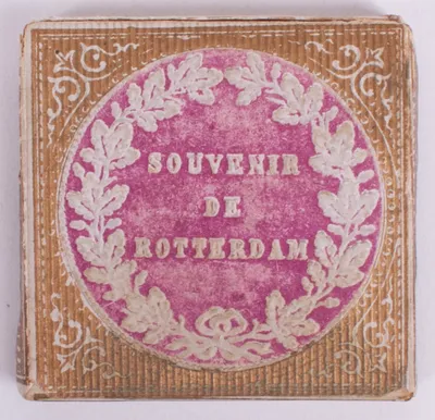 Leporello, ca. 1890, with 13 circular photographic townscapes, each with a diameter of 4 centimeter, folded in the original badge-shaped silver-coloured cardboard box with the...