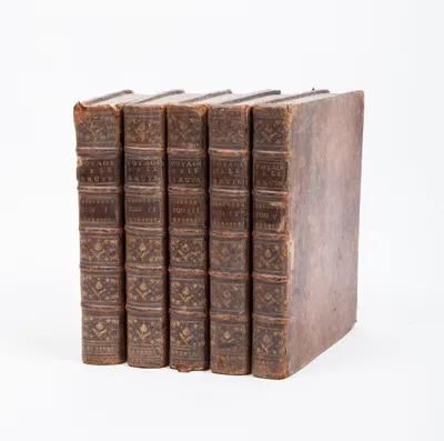 Johannes Allart, Amsterdam, 1st ed., 1799-1800. 339, 326, 350, 308 pp. In marbled contemporary binding with handwritten spine vignette. Complete with 37 engravings, 2 plans and...