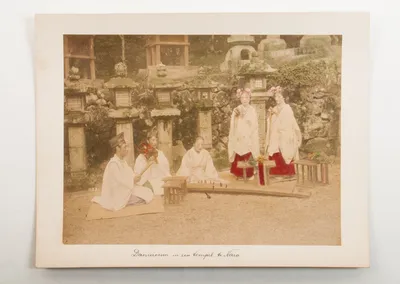 Dancers in a temple, Nara. 20.3 x 27 cm. - and 5 other photos. All hand-coloured and on paperboard. In good condition.