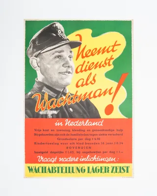 in Nederland. Vrije kost en inwoning, kleeding en geneeskundige hulp. Bij gehuwden zijn ook de familieleden tegen ziekte verzekerd. Wachabteilung Lager Zeist. ALA-Remaco. 80 x 55 cm.