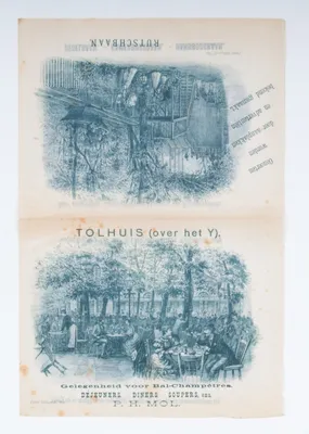 P.H. Mol. Advertisement on large blotter in 4 parts. "Gelegenheid voor Bal-Champêtres; Alle mogelijke Gymnastiekwerktuigen en Kinderspelen; Rutschbaan en Kegelbaan-Kamerbuksbaan-Handboogbaan"....