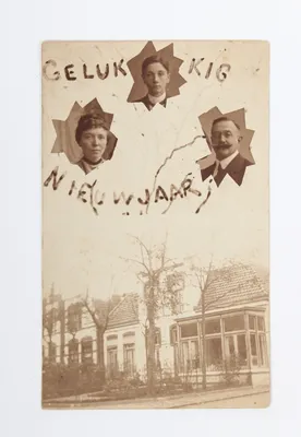 New Year's greeting card of the Vestdijk family. Front with both Simon Vestdijk, Jr. and Sr. and Anna Mulder, below the house at Zuid Ooster Singel 43 in Harlingen.