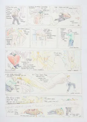 Undated original comic story in pen and coloured crayon starring Reviaan "Mannetje Mootz" ("in zijn leren broekje!"), consisting of 5 strips each 10 x 35 cm., numbered 1 to 5 and...
