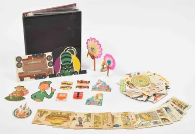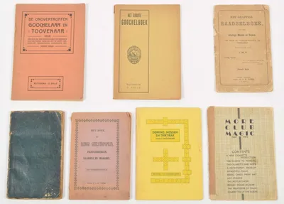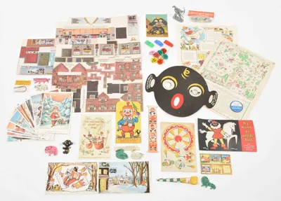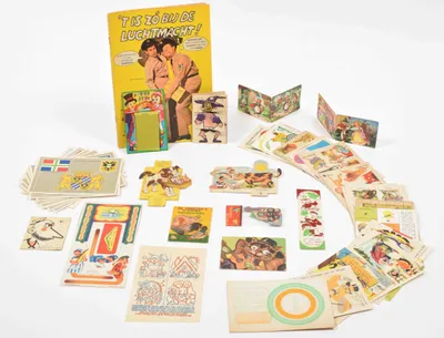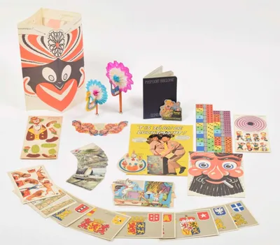 Lot of 74 paper Snoepjes van de Week. De Gruyter, c. 1950-1970. Incl. magic slate, shooting game, magic drawing book, etc.