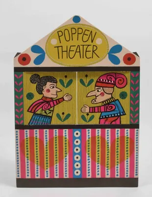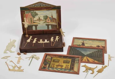 Dutch shadow theatre with 4 wooden frames, each with a different chromolithogr. scene on very thin paper, to be put in a painted wooden proscenium (38 x 40 cm), with 22 (partly...
