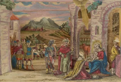 Perspective scene. Complete set, comprising 6 contemporaneously handcoloured engraved scenes. Augsburg, M. Engelbrecht, c. 1780. 7.2 x 10 cm.