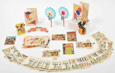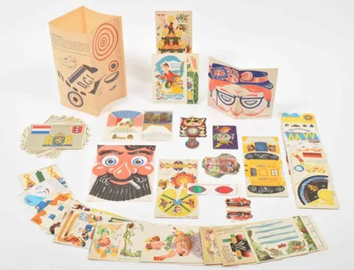 Lot of 64 paper Snoepjes van de Week. De Gruyter, c. 1950-70. Incl. clown, harlequin, climbing monkey, magic die, De Gruyter's Visspel and more. Added: approx. 80 coupons from...