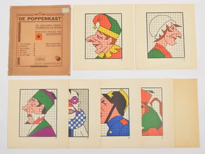 Zes gekleurde teekenvoorbeelden op ruiten benevens twaalf vel teekenpapier. A. Tonneman Jr. (ill.). Amsterdam, De Volharding, c. 1940. Complete with 6 pages and 12 sheets of paper...