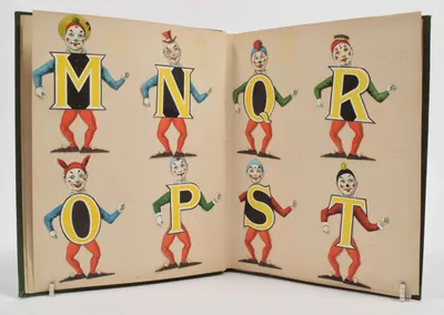 Series of movable letters mounted in album (4 on each page, 2 on the last p.). Album also filled with 205 other scraps, some related to another ABC, mostly different scraps depicting...
