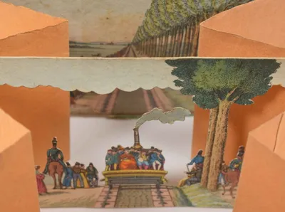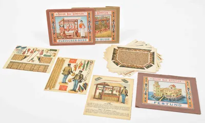 5 (of 6) complete and wonderfully preserved cut-outs in original wrapping, Germany, c. 1880: (1) Fleischer-Bude; (2) Gärtnerei; (3) Fünfzig-Pfennig-Bazar; (4) Festung; (5) (= no....