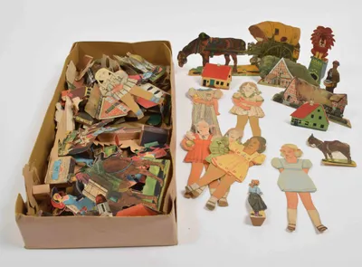 consisting of 31 circus figures and animals, 26 (farm)houses, 3 churches, 2 mills, 19 human figures/ (working or farm) animals and 7 paper dressing dolls, various sizes (smallest...