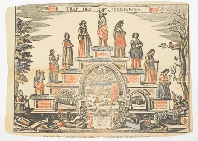 Catchpenny print with 1 single large thumb-coloured woodcut depicting a "women's steps of age", 25.6 x 34.5 cm, with address Amsterdam, Casparus Loots-Man, c. 1700.