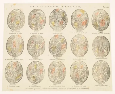 Catchpenny print with 15 oval thumb-coloured woodcuts depicting biblical scenes, sheet size 33 x 42 cm, with address Rotterdam, Jacobus Thompson, c. 1795, numbered 100 in upper...