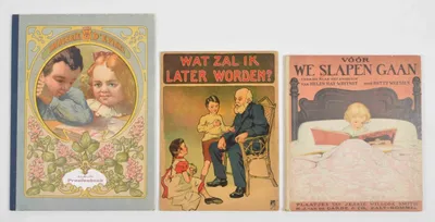 No pl., no publ., no date. 5 full-page coloured ills. Orig. ills. wrappers, folio. 1 pp. loose, spine splitting + Vóór we slapen gaan. Versjes naar het Engelsch van Helen Hay Whitney....
