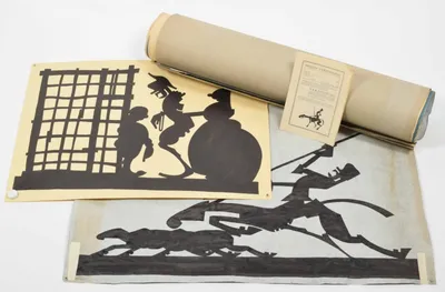 7 original shadow screens from the shadow play 'De Roemruchtige bedrijven van ridder Don Quixote de la Mancha' by Pieter van Gelder, 1926. With admission ticket and programme for...