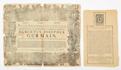 Hubertus Josephus Germain. Catchpenny print, 35 x 43 cm (leaf), comprising a letterpress obituary of Hubertus Josephus Germain, "Ecclesiae Succursalis de Lanaeken Pastor (...).",...