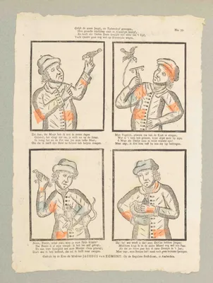 hun grootste blydschap vind in Kinderlyk bedryf (...)." Catchpenny print with 4 thumb-coloured woodcuts depicting children playing with birds and a cat, sheet size 42.5 x 31 cm,...