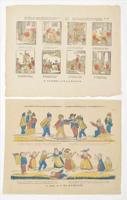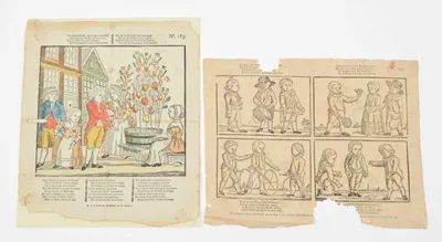 dat gy speelgenoten ziet, gy moogt in hun bydschap deelen, maar in hunne twisten niet." Catchpenny print with 2 large stencil-coloured woodcuts, sheet size 33.5 x 41 cm, with letterpress...