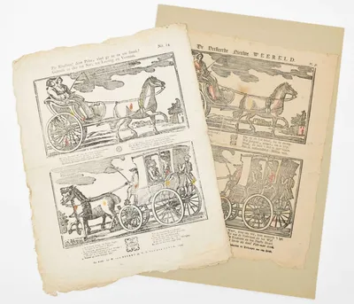 Gebruik ze dan tot Nut, tot Leering en Vermaak." Catchpenny print with 2 woodcuts depicting carriages, touched with colour, sheet size 45 x 34 cm, with letterpress title and numbered...
