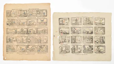 Contemp. stencil col. lithographed catchpenny print, with a series of illustrations that reads like a comic, sheet size 44 x 35 cm, signed "Knilling" in lower left corner with...