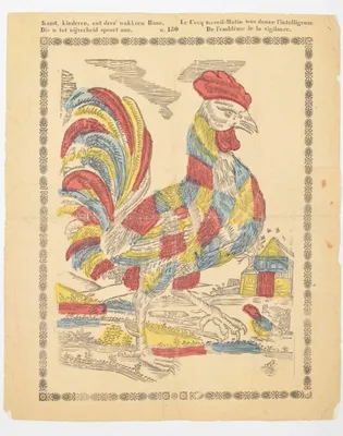 die u tot nijverheid spoort aan." "Le Cocq-Matin vous donne l'Intelligence De l'emblème de la viglance." Stencil coloured catchpenny print with one single large woodcut monogrammed...