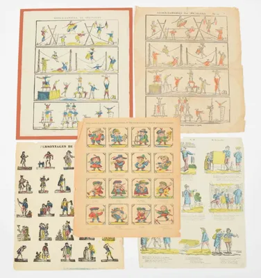 6 cut-outs (Bogen 1-6), Modellir-Bogen no. 206, c. 1890. Each sheet 25 x 44 cm + Der Scheerenschleifer. Bewegliche Bilder, durch Sand getrieben. 4 cut-outs in orig. packaging,...