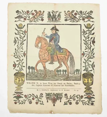 Stadhouder, Capitein Generaal en Admiraal der Nederlanden." Contemp. hand- or stencil-coloured catchpenny print, with a central large woodcut of William V on his horse, surrounded...