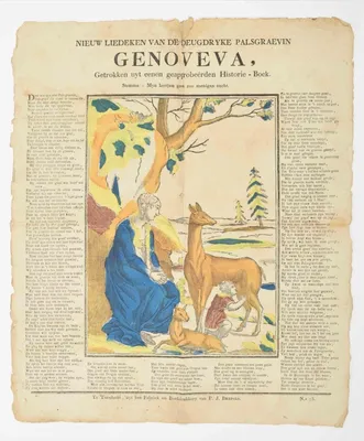 getrokken uyt eenen geapprobeerden historie-boek. Stemme: Myn hertjen geeft zo menigen zucht." Catchpenny print with contemp. handcol. central large woodcut, surrounded by letterpress...