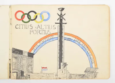 Sketchbook with 38 used pages. Stamp front A.H. Bijland, 4 Aug. 1928. Fine sketchbook with drawings of the Olympic Stadium, the Dutch hockey team, the FIFA board, players of the...
