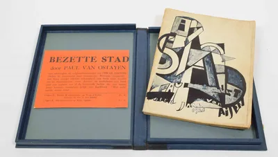 Bezette Stad. Antwerp, Het Sienjaal, 1921. [150] pp. Original illustrated wrapper. Added the printed part of the original belly band. 4to. 28.5 x 22 cm., printed in an edition...