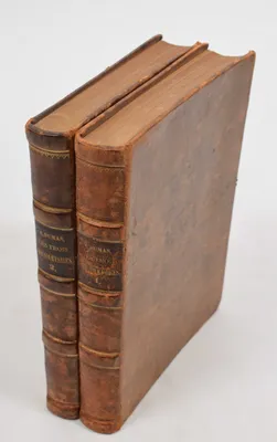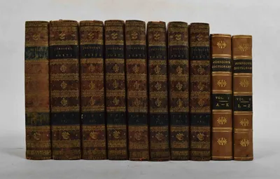 The Rambler. In four volumes. London, A. Millar [et al.], 1756. Small 8vo, 4 vols., leather, uniformly bound, title in red and gilt stamping, boards with typographical embroidery...