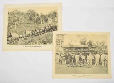 'Rijstbouw, Java' (c. 1915-1924) and 'Passer te Kaban Djahè' (1932) from Henri Zondervan, Insulinde in woord en beeld. Groningen/ Batavia, J.B. Wolters. Both ± 74 x 104.5 cm +...
