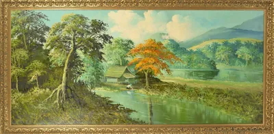 With central hut and kneeling person. 163 x 73.5 cm. Oil on canvas. Signed 'Iskandar' bottom left. In gilt frame.