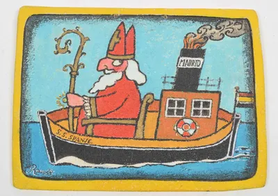 Ceramic tile with image of Sinterklaas aboard his steamboat. Reverse with signature and stamped mark and title "De goed-heilig man". Unica, c. 1980. Executed by his own studio.