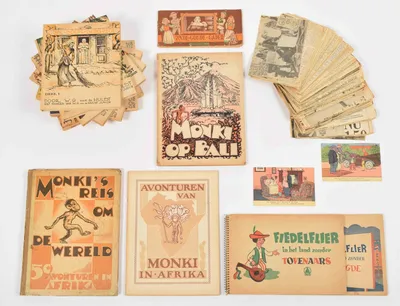 Spaarnestad, 1948. 64 pp. Stapled. Clean copy + Monki op Bali, 1950 + Monki's reis om de wereld. 50 avonturen in Afrika, 1937. Spine and boards with traces of use, stamp on title...