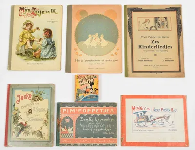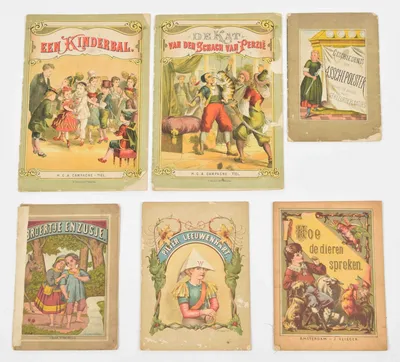 6 lithographs printed on one side, c. 1870. Spine restored + Hansje Knipperdolletje. Met 8 gekleurde plaatjes. 8 p. Circa. 1882 + from the same series: Jaapje Sta stil; Daar komt...