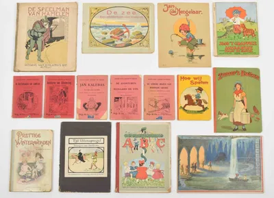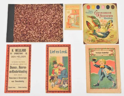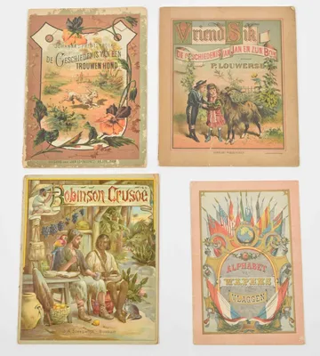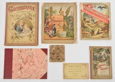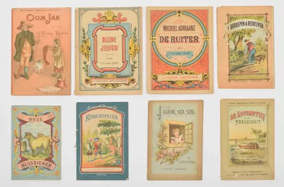 Amsterdam, J. Vlieger, c. 1885 + Onze Huisdieren. 8 p. + Kinderspelen. 6 p. + Michiel Adriaanz de Ruiter. F.H. van Leent + Blijde Jeugd. F.H. van Leent. All Amsterdam, J. Vlieger,...